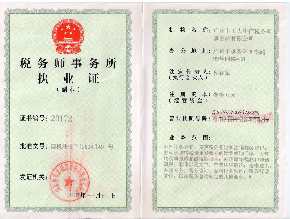 2004年11月,為適應(yīng)稅務(wù)代理業(yè)務(wù)的發(fā)展,以正大中信的稅務(wù)業(yè)務(wù)部為基礎(chǔ)組建成立了廣州市正大中信稅務(wù)師事務(wù)所有限公司,專業(yè)從事稅務(wù)代理、稅務(wù)鑒證、稅務(wù)策劃服務(wù)。